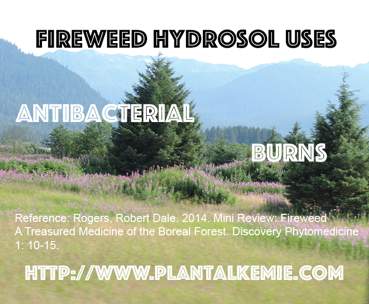 As far as I know, I don’t think there is an essential oil that is commercially available. However, there is a fireweed hydrosol but (at the time of this writing) I have not used it. I think it is a rare hydrosol that is not commonly available, so all of its properties have not been completely figured out yet. The hydrosol is not mentioned much in the aromatherapy or herbalism literature. However Rogers states that though there is not much research done on it, he thinks the hydrosol is probably antibacterial and it might be useful for burns4.